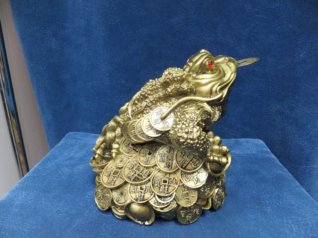 Трехлапая жаба с монеткой во рту — символ большой удачи и денежного изобилия. Чаще всего она изображается сидящей на подставке из монет или слитков с символом Инь-Ян на спине. Монетка во рту олицетворяет богатство. Самый простой способ для привлечения денежной удачи - поместить лягушку в юго-восточной части комнаты или поставить на рабочем столе с левой стороны, но не прямо перед собой. Лягушка должна смотреть внутрь дома, как бы впрыгивая в него неся с собой богатство и удачу.